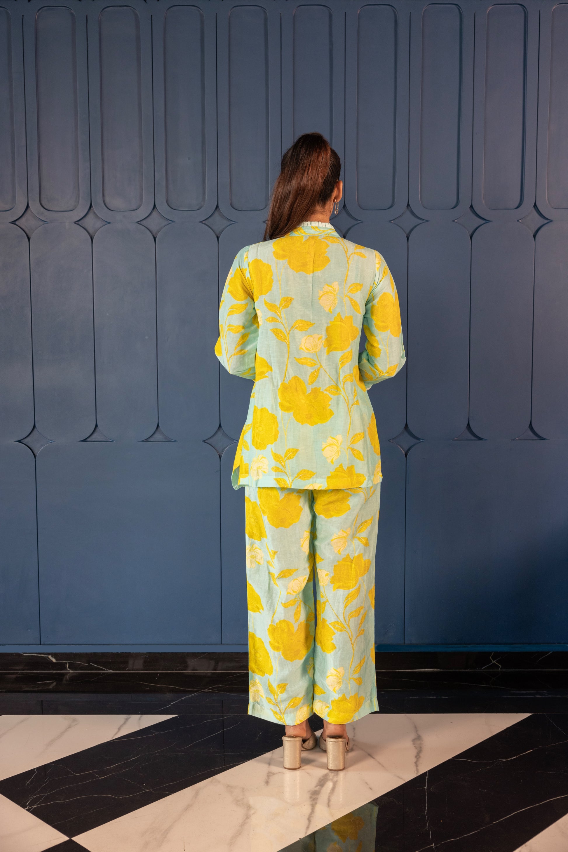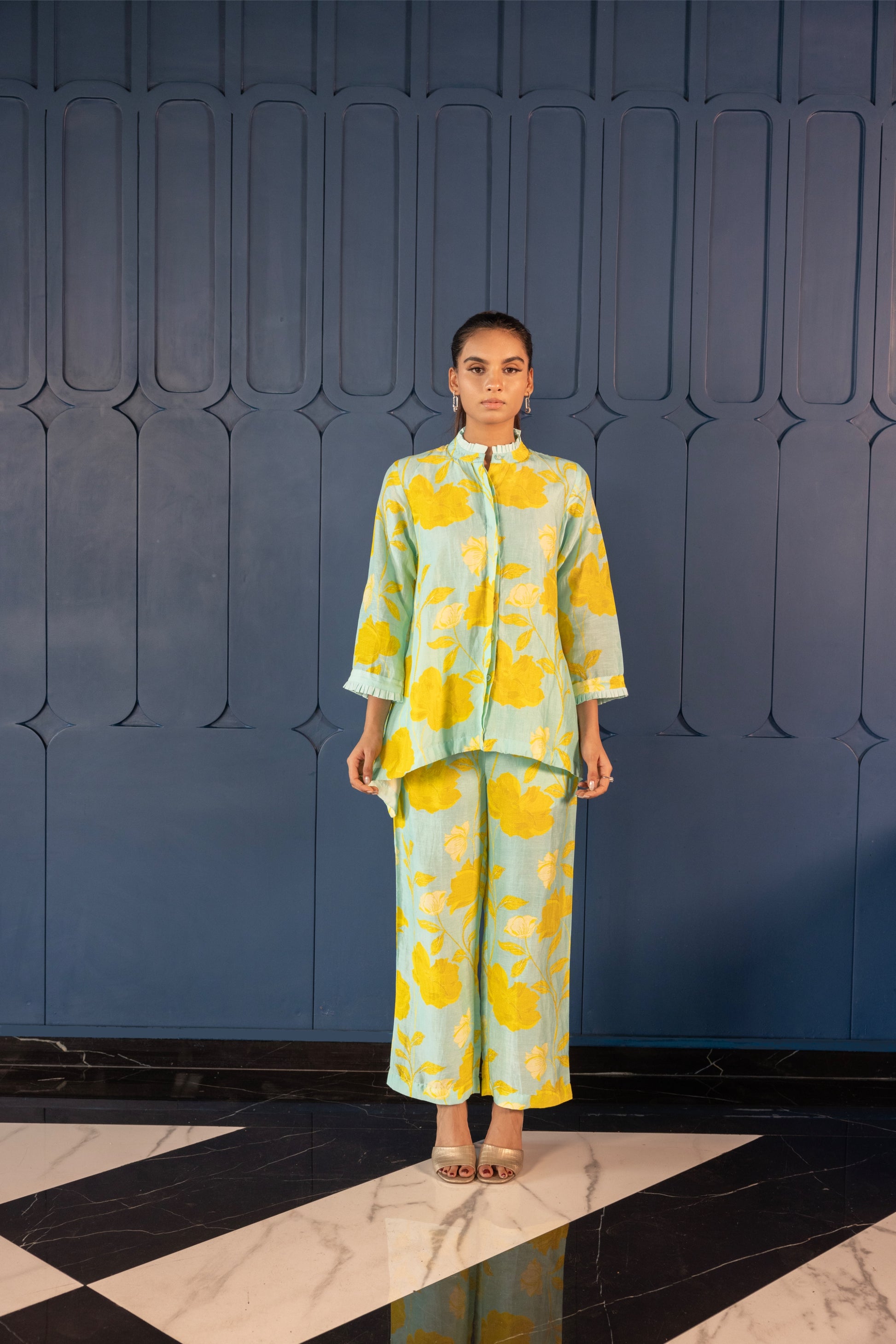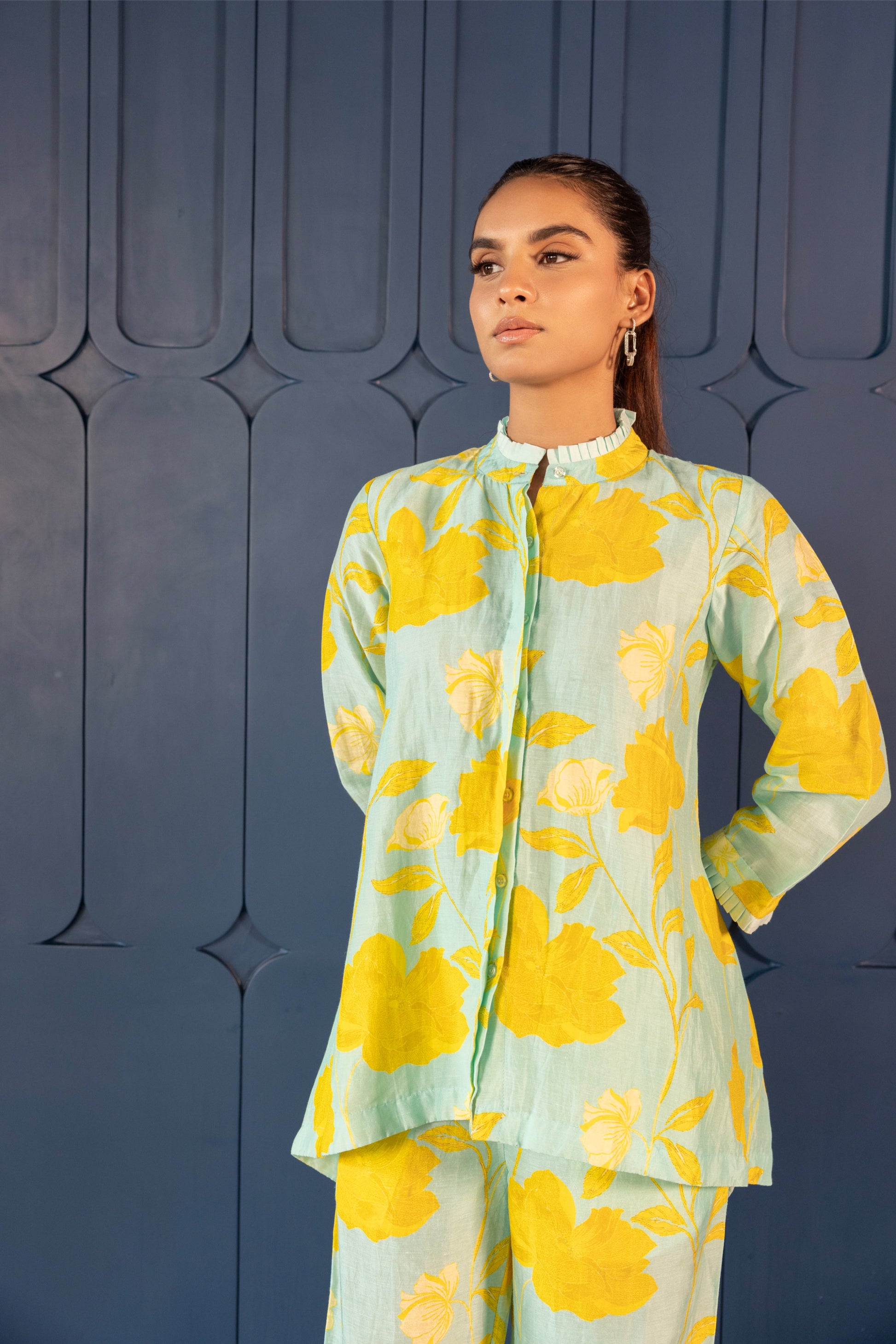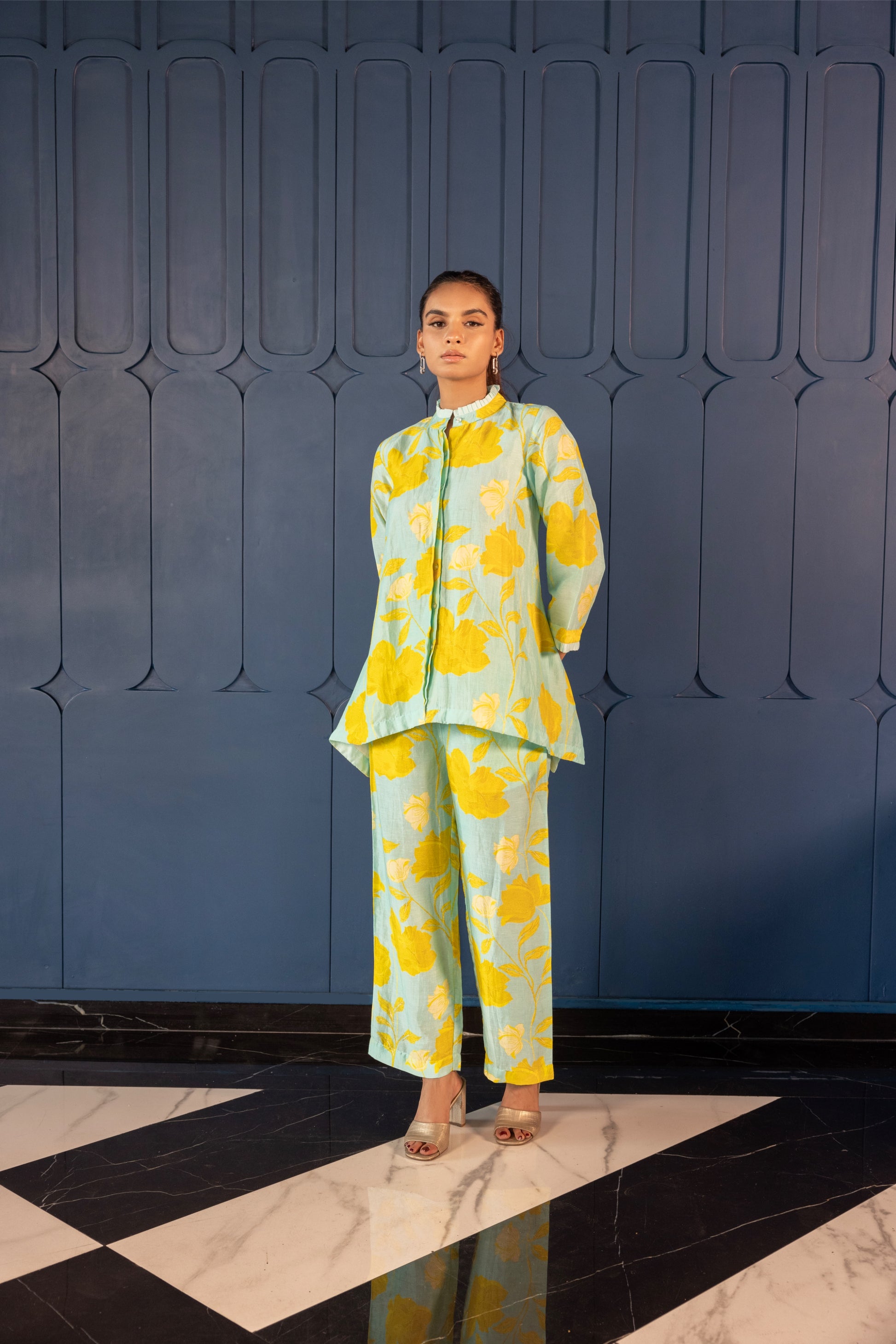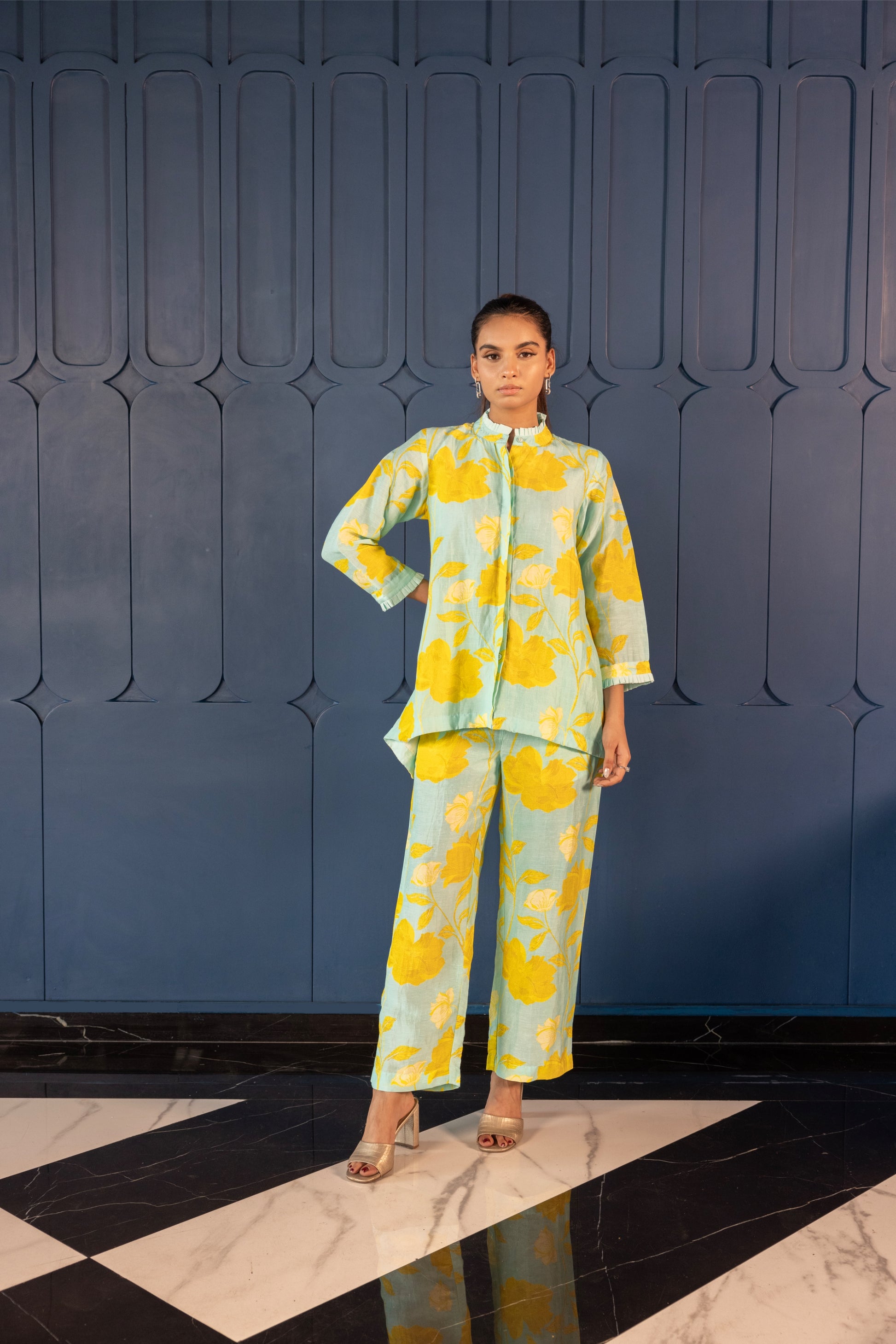 Design & Detailing: A longline tunic-style top with an asymmetric hem, button placket, and mandarin collar. Paired with relaxed straight-fit trousers, the bold yellow florals against aqua blue bring an instant pop of vibrancy.