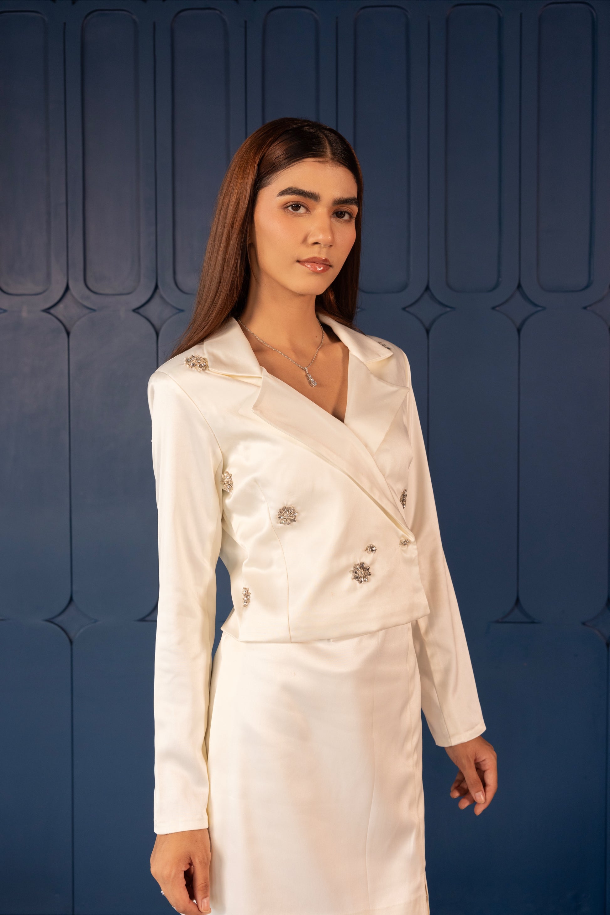 Silhouette & Features: Blazer-style wrap silhouette with intricate handwork that adds subtle glam to the clean lines.
