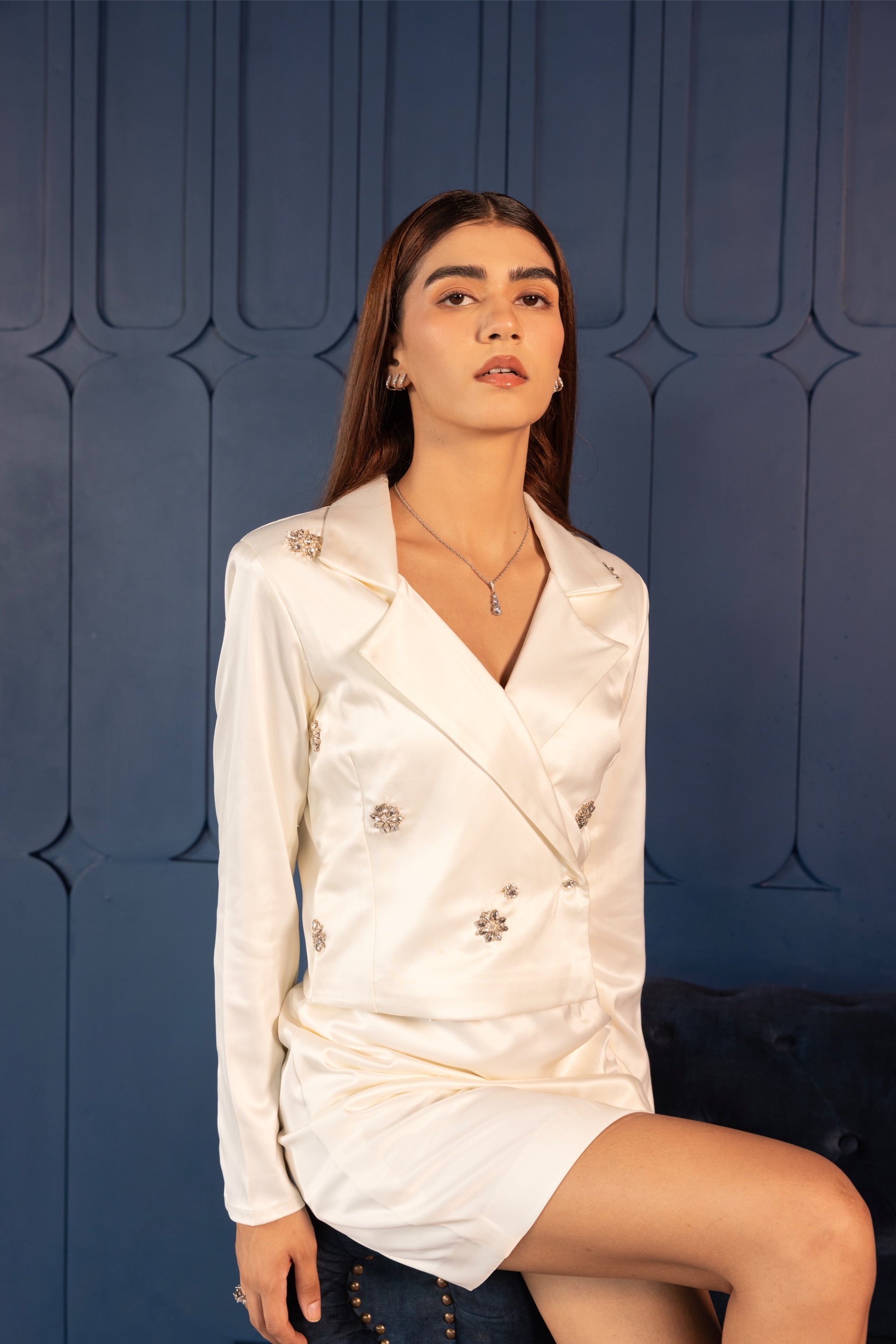 Details: This ivory blazer dress features crystal hand-embellished floral brooches, a sharp notch lapel collar, and a tailored fit that flatters the form. The dress comes with full sleeves and a sleek mini skirt hemline, merging femininity with power dressing.