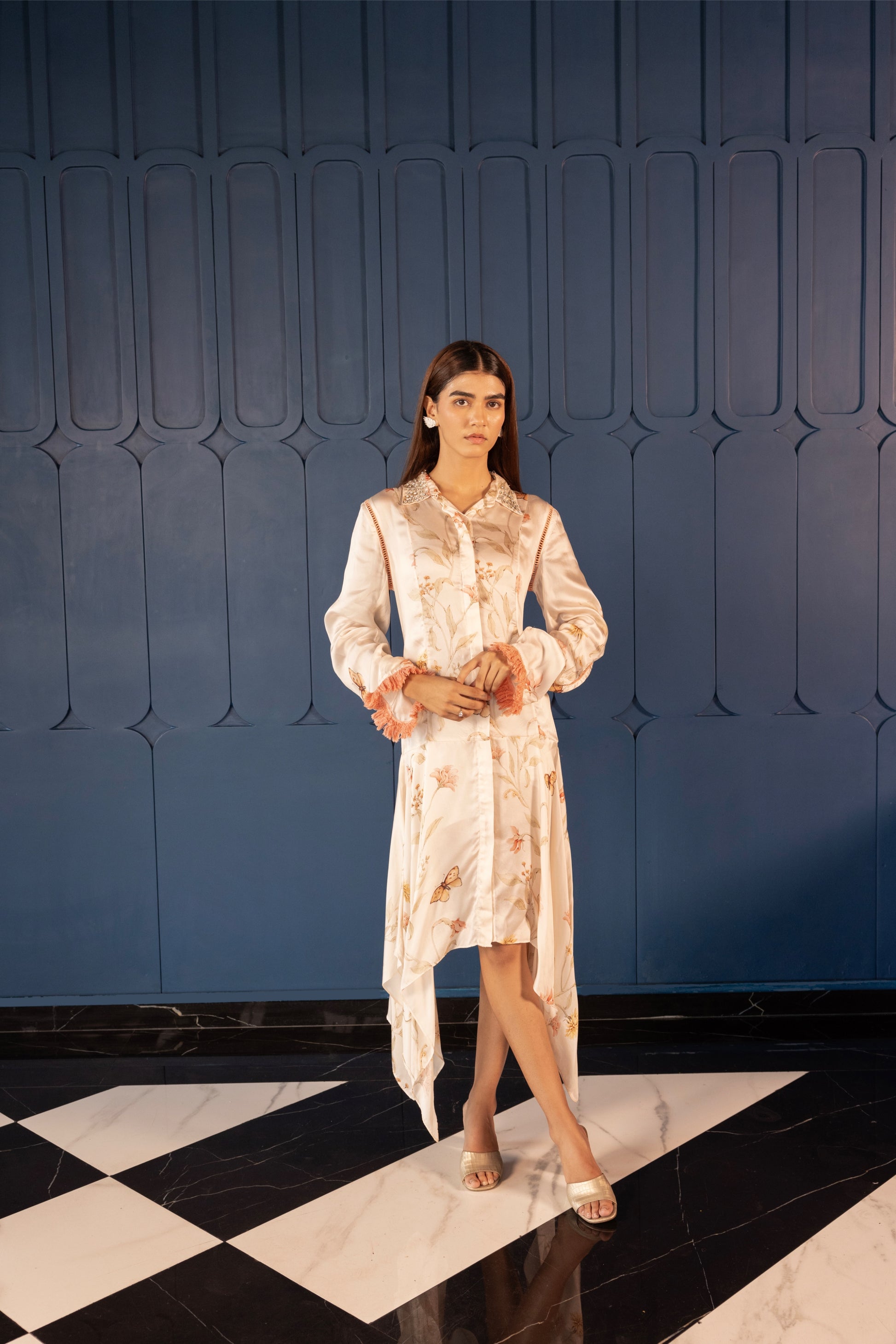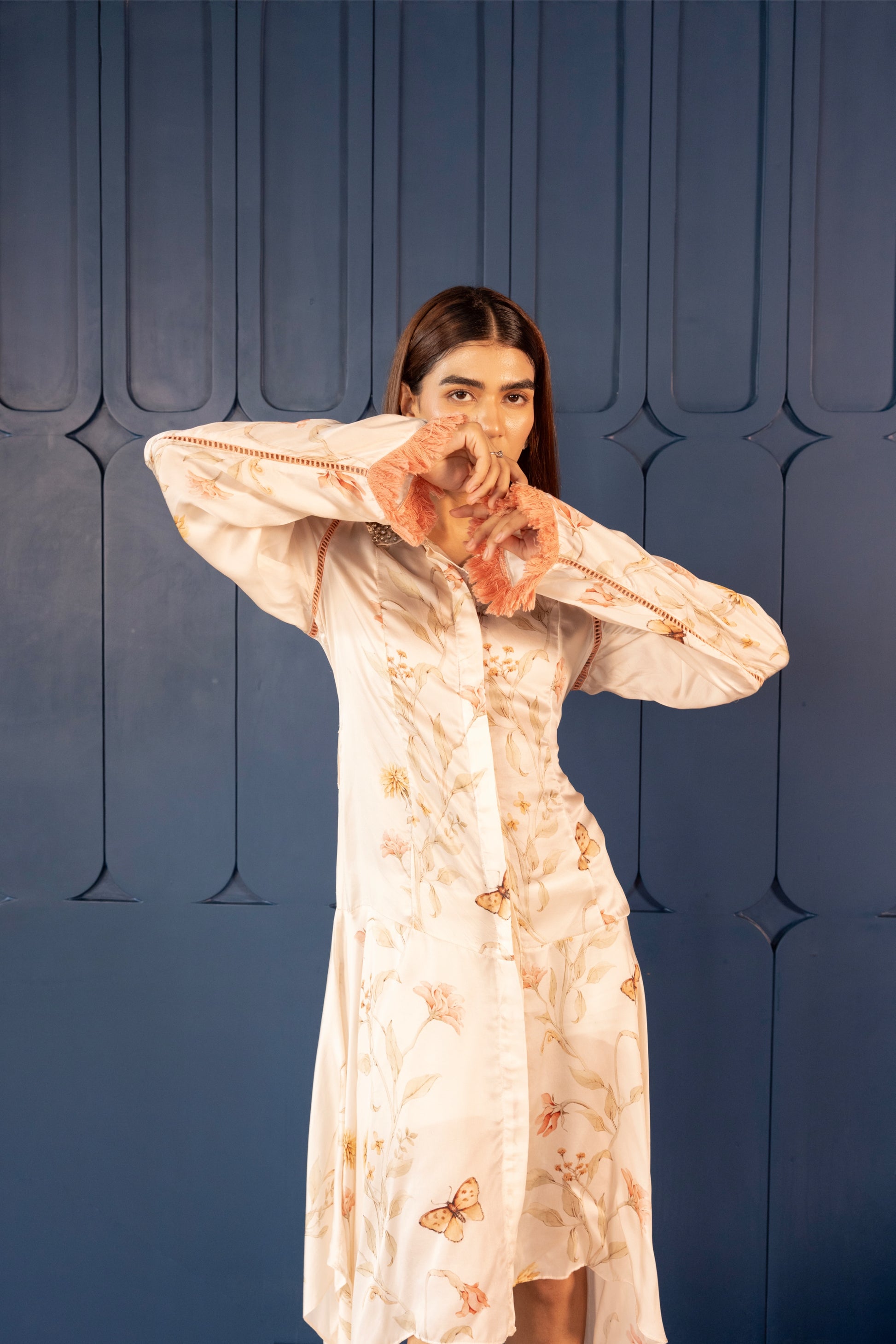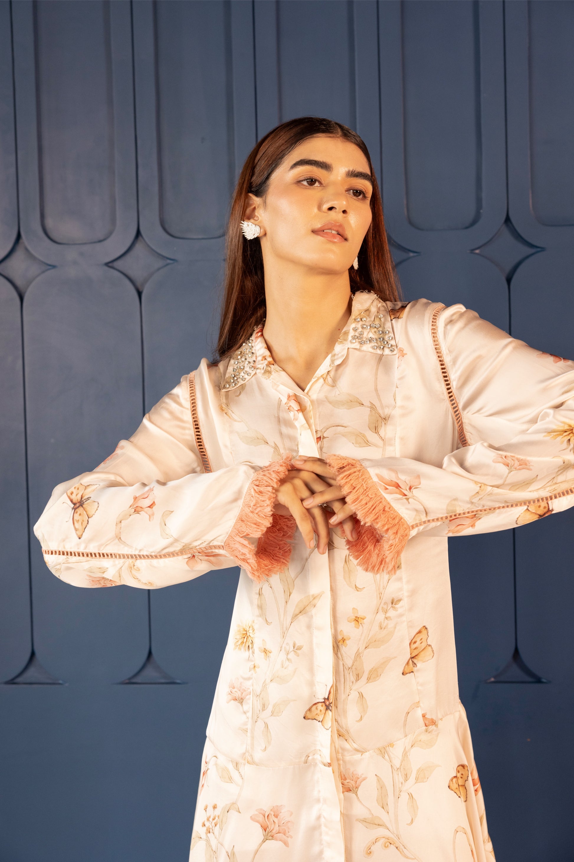 Design & Detailing: A soft base adorned with delicate floral and butterfly prints. Designed with a collared neckline, full sleeves featuring subtle lace trim at the cuffs, and an asymmetrical hemline that adds modern flair to its flowy silhouette. Button-down detailing keeps it chic yet effortless.