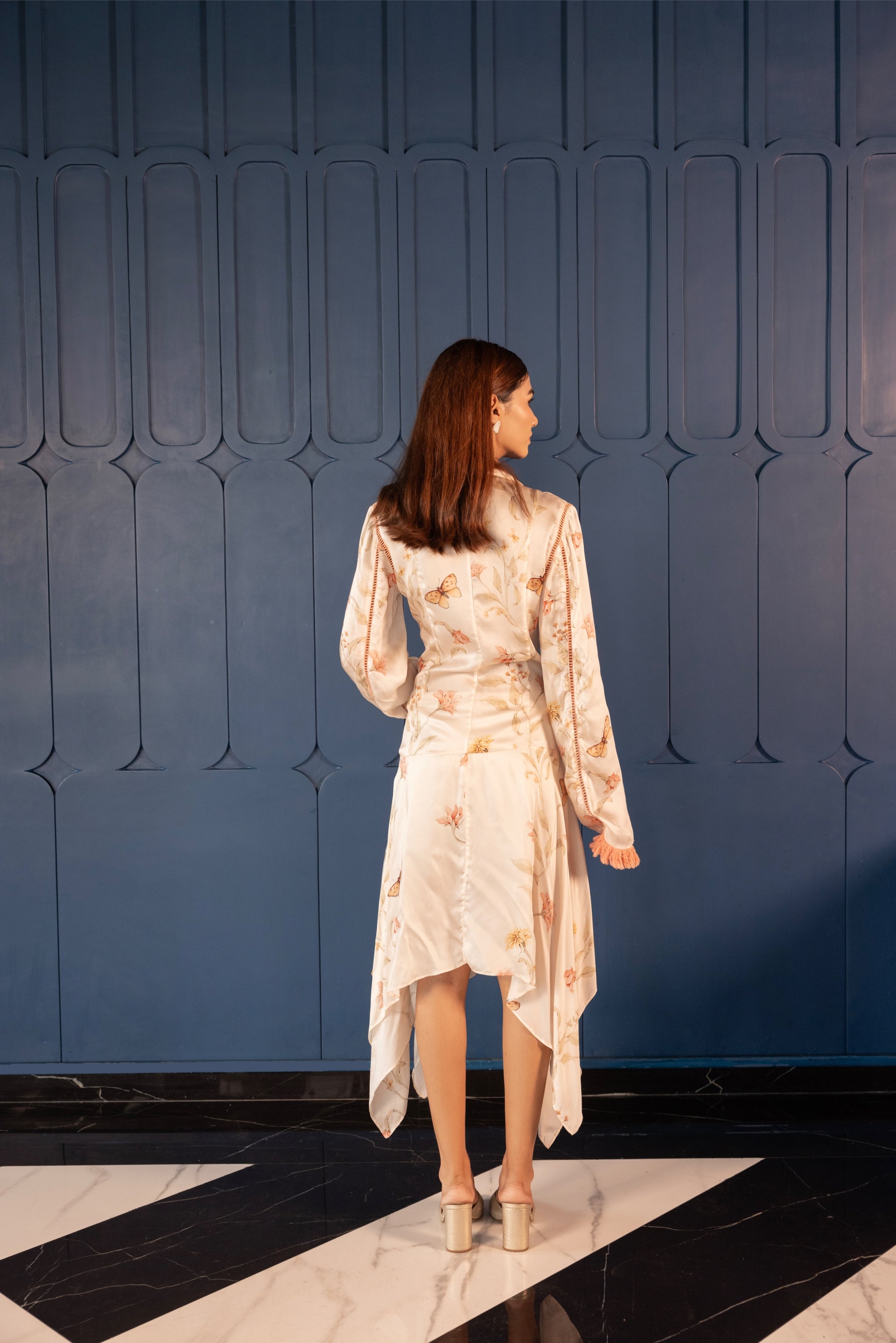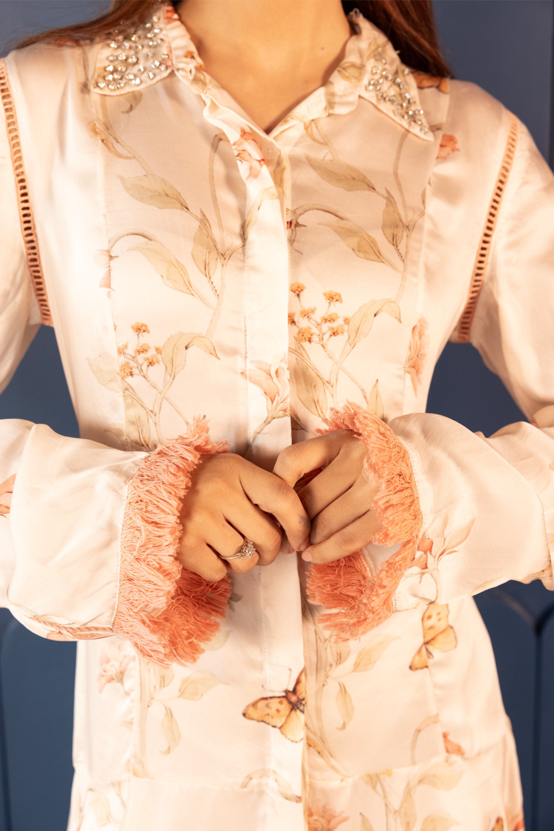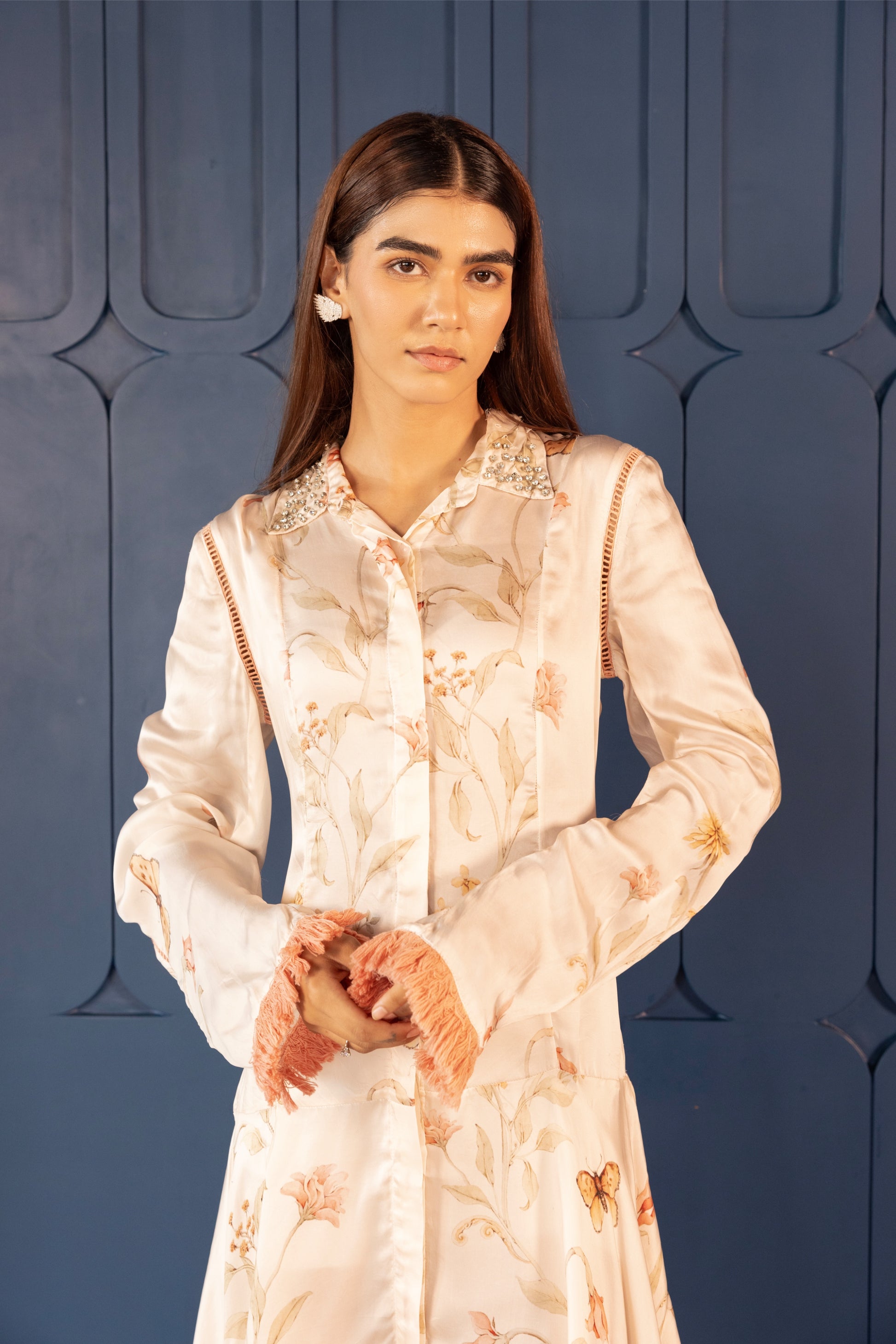 Design & Detailing: A soft base adorned with delicate floral and butterfly prints. Designed with a collared neckline, full sleeves featuring subtle lace trim at the cuffs, and an asymmetrical hemline that adds modern flair to its flowy silhouette. Button-down detailing keeps it chic yet effortless.