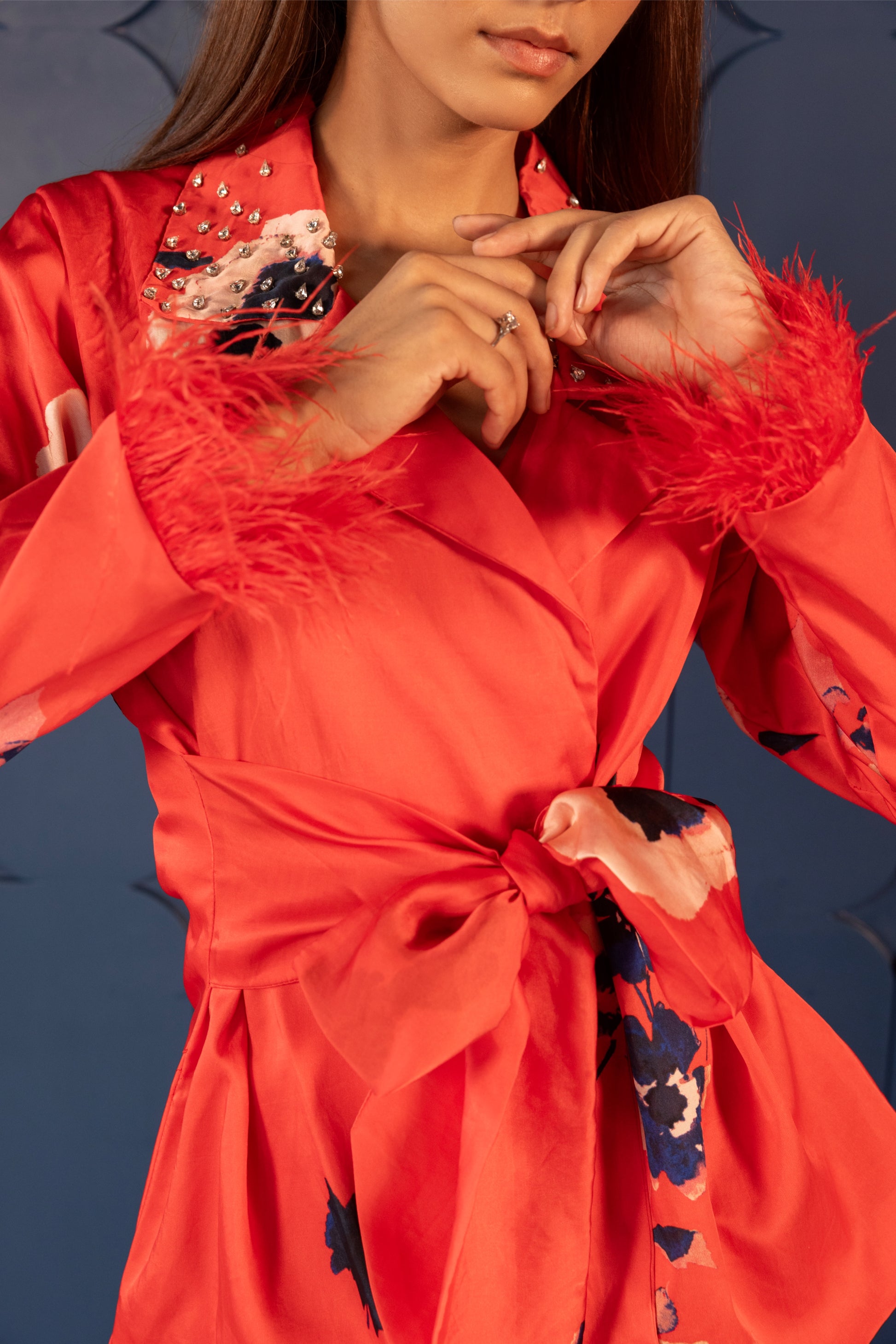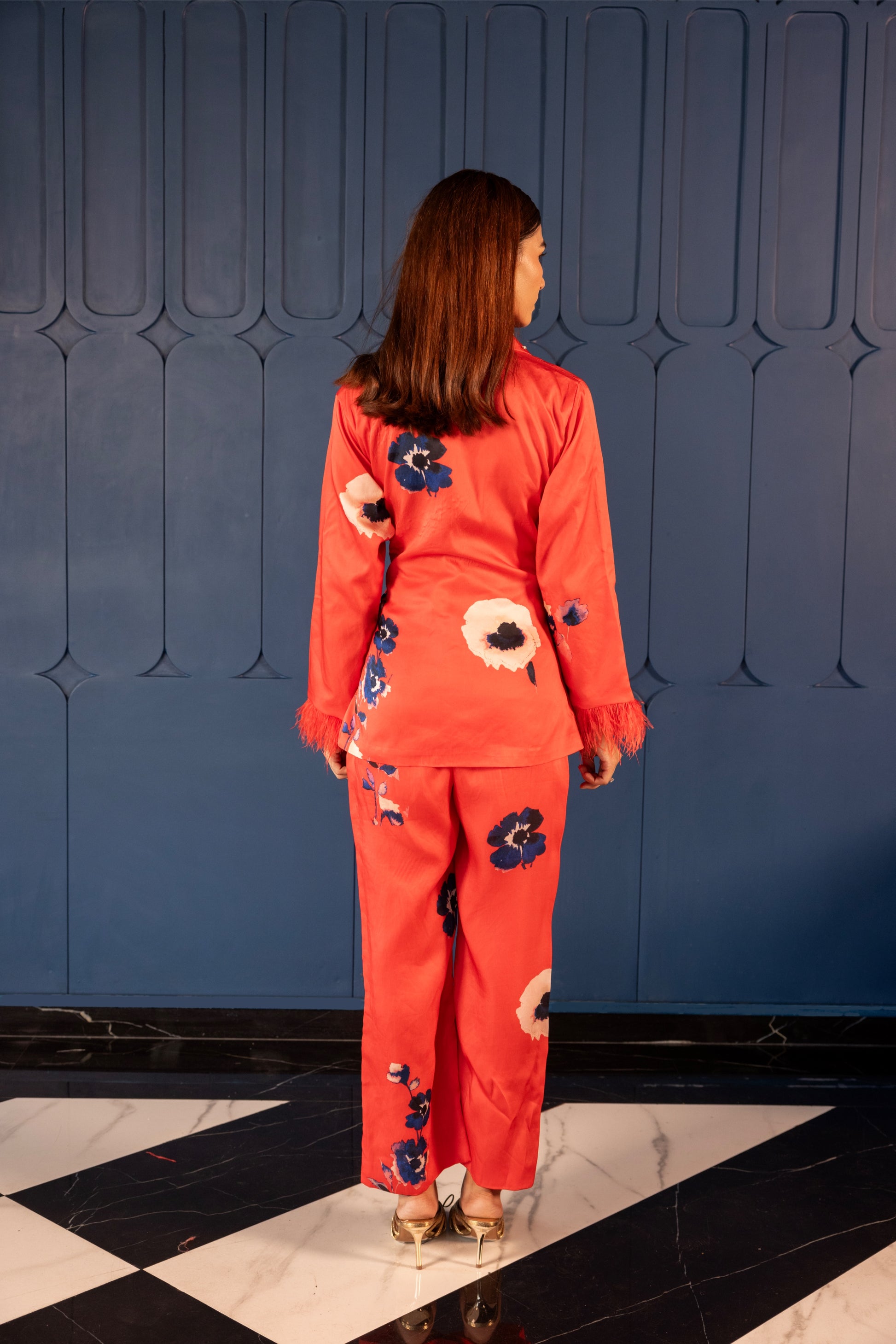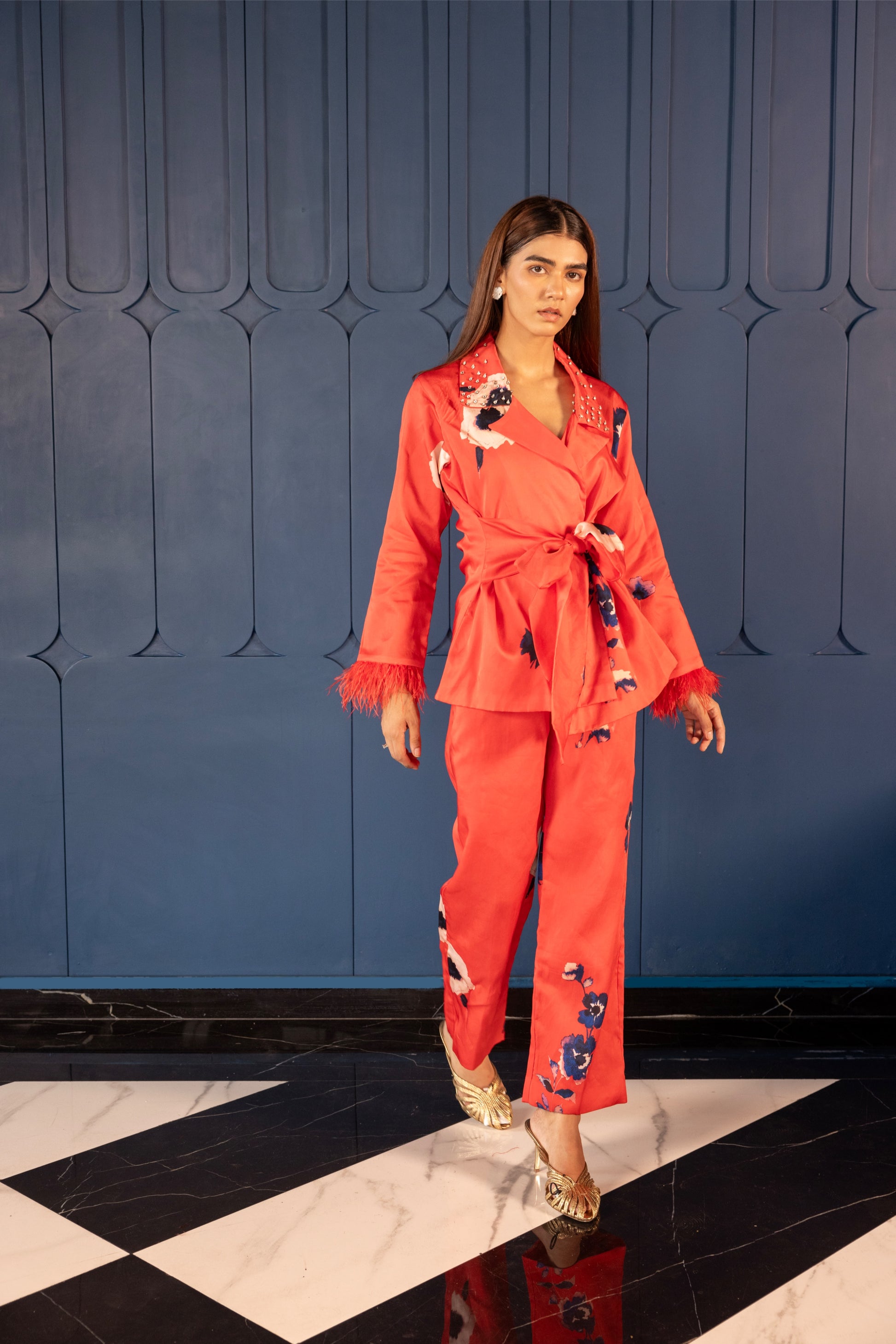 ย Design & Detailing: A chic rust-red wrap jacket paired with straight trousers. The jacket features a tie-up waist belt for a defined silhouette, floral embroidery on the collar, and playful feather-trimmed sleeves that add movement and glamour. The trousers are detailed with bold floral motifs in navy and ivory for a balanced, standout look.