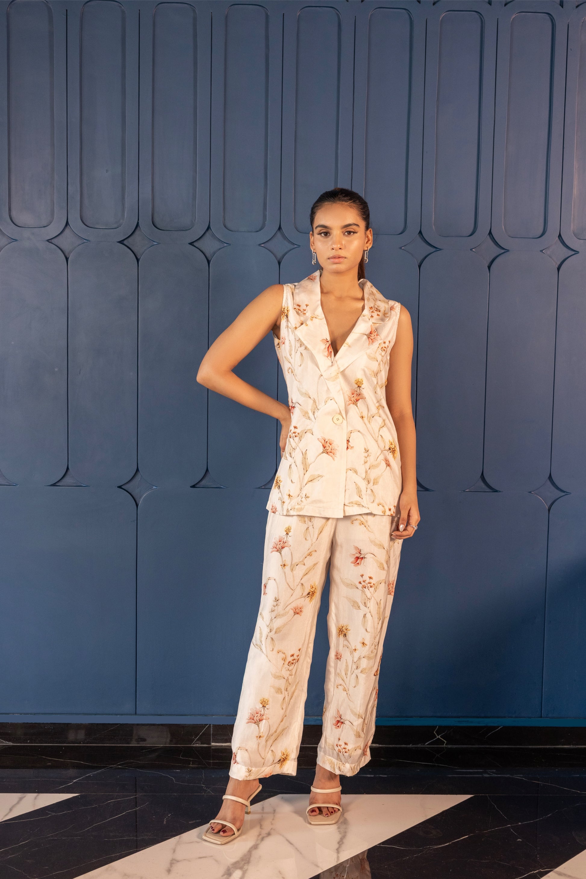 Design & Detailing: A sleeveless, double-breasted blazer with a sharp lapel collar paired with straight-leg trousers. The canvas is adorned with delicate floral motifs in muted pastels, creating a perfect balance of sophistication and freshness. Functional buttons and clean tailoring give it a polished edge.