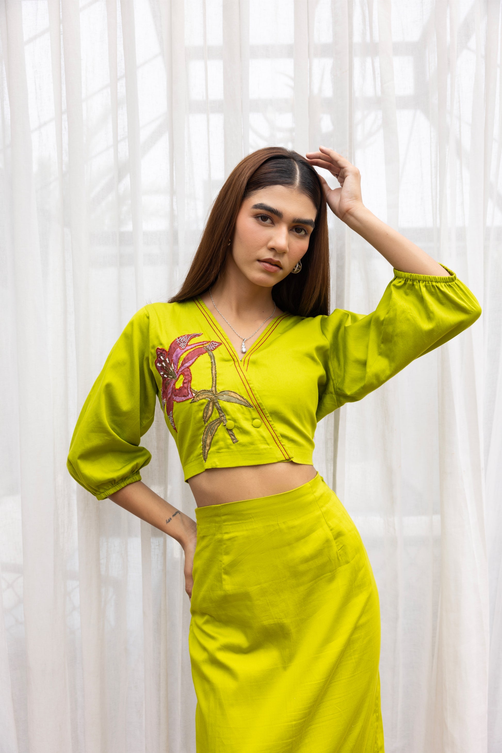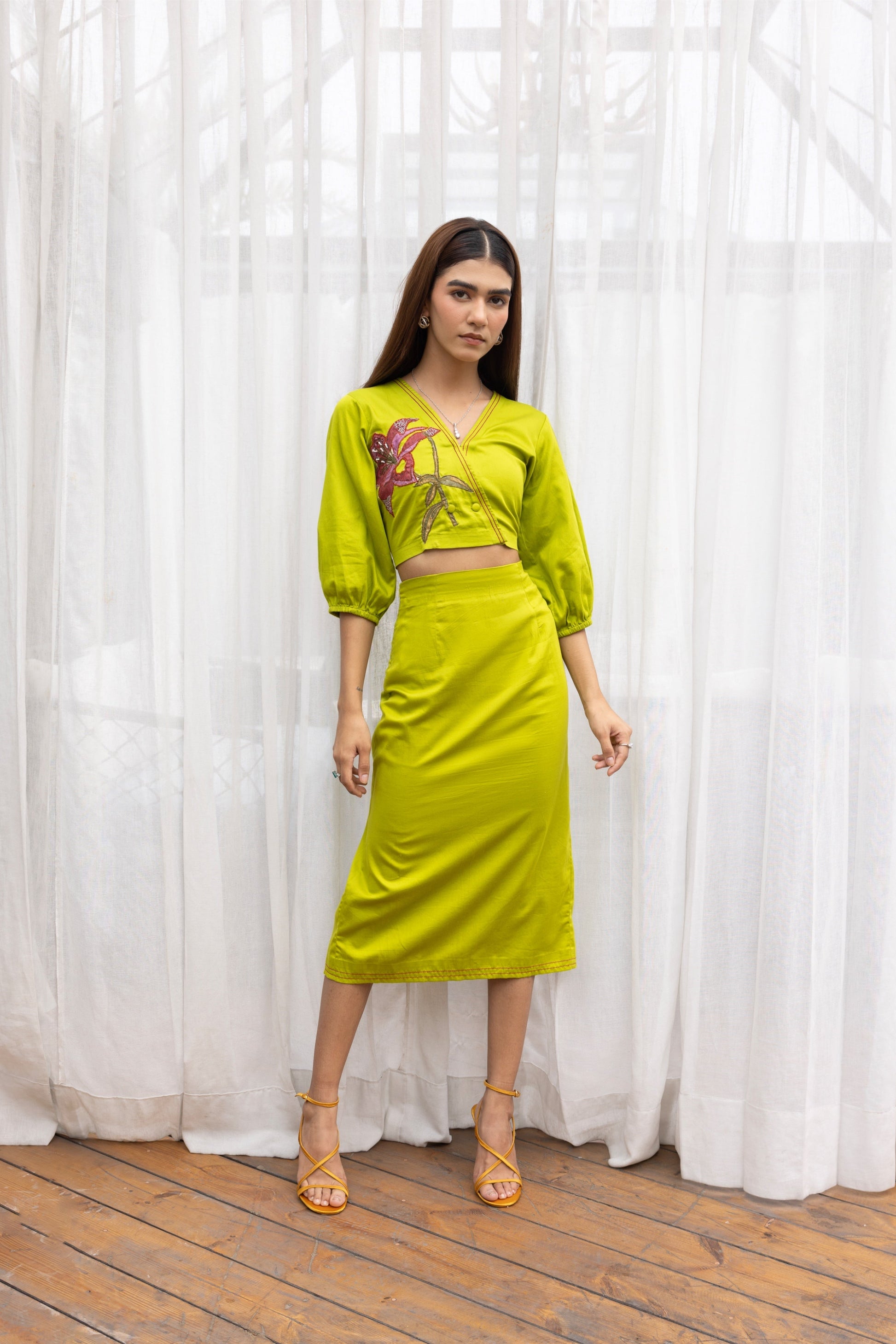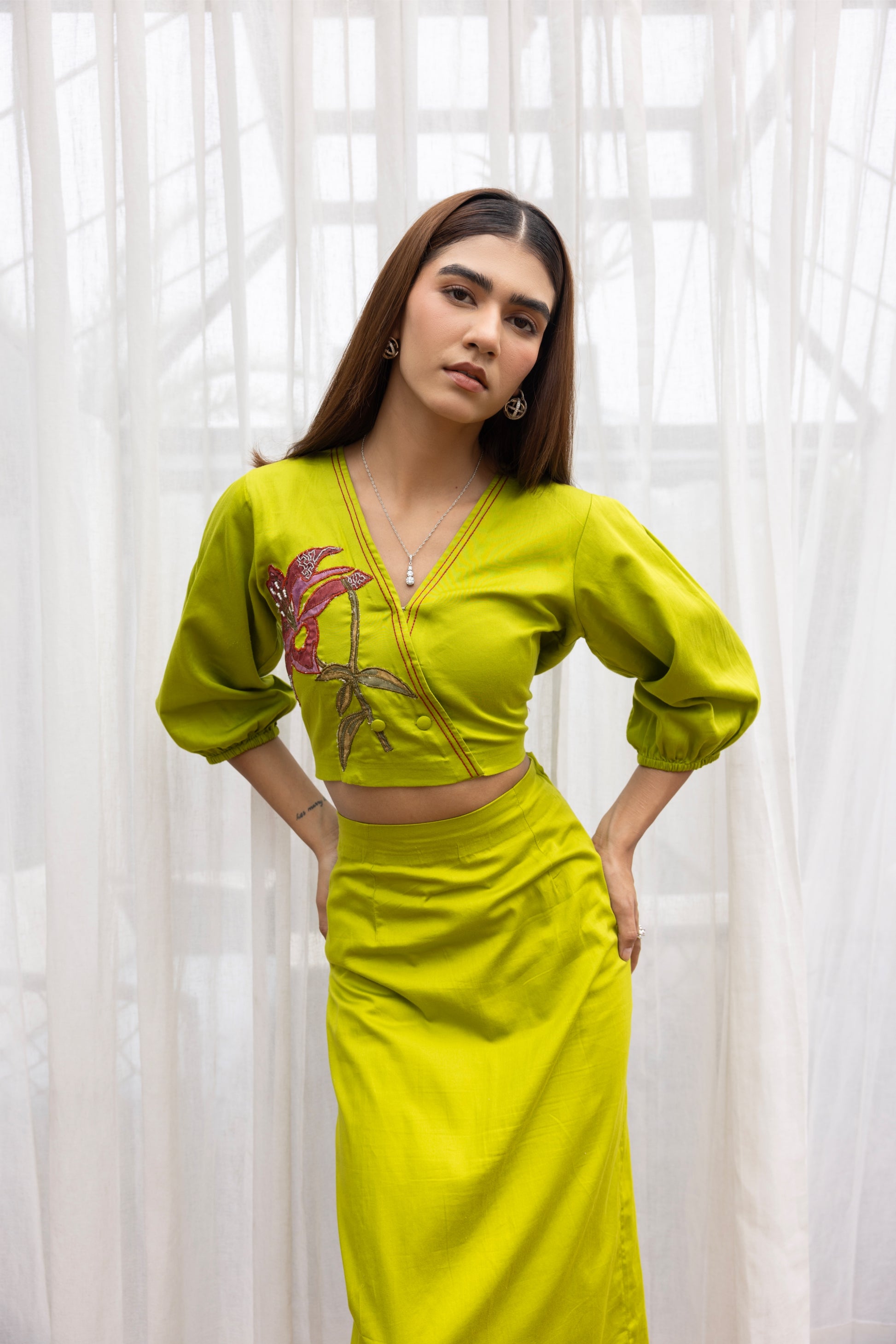Step into statement style with this vibrant co-ord set featuring a structured crop top and midi skirt in a bold lime hue. The top is accented with a striking hand-embroidered floral motif in shades of magenta and green, adding a playful yet artistic flair. Subtle balloon sleeves and a V-neckline enhance the silhouette, while the skirt hugs the body with clean lines and a back slit for easy movement and a touch of allure.