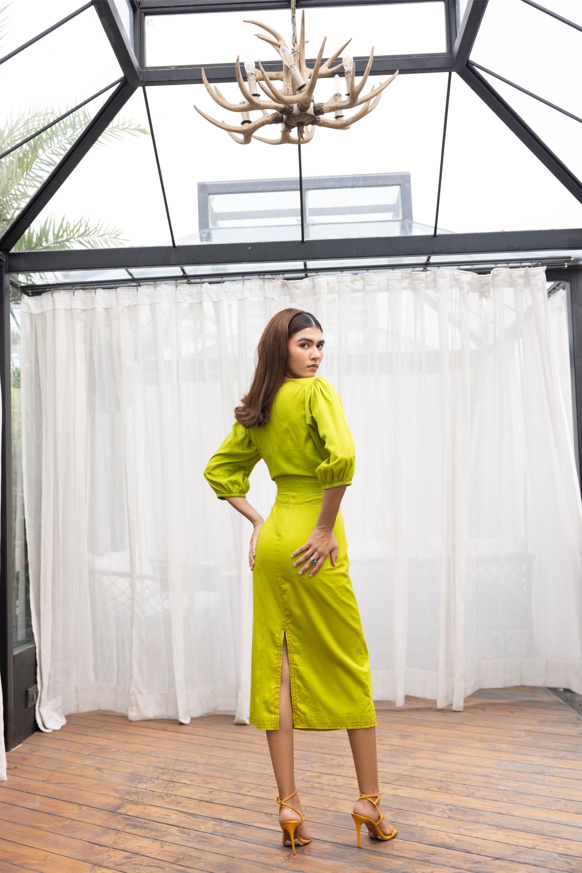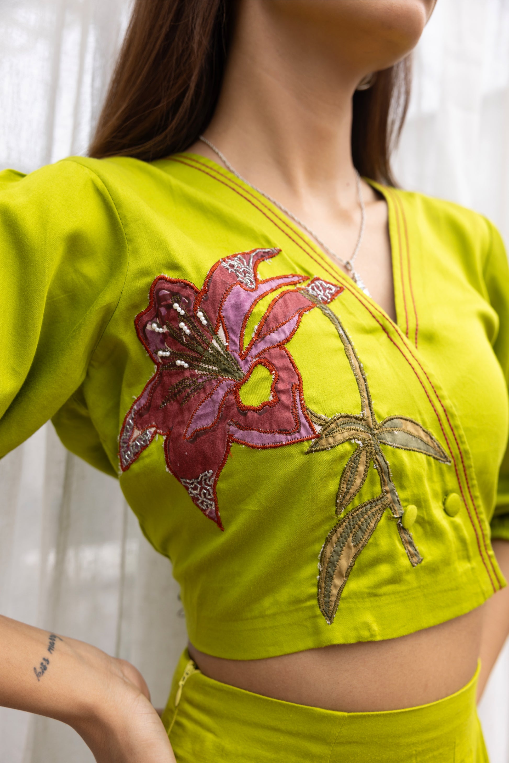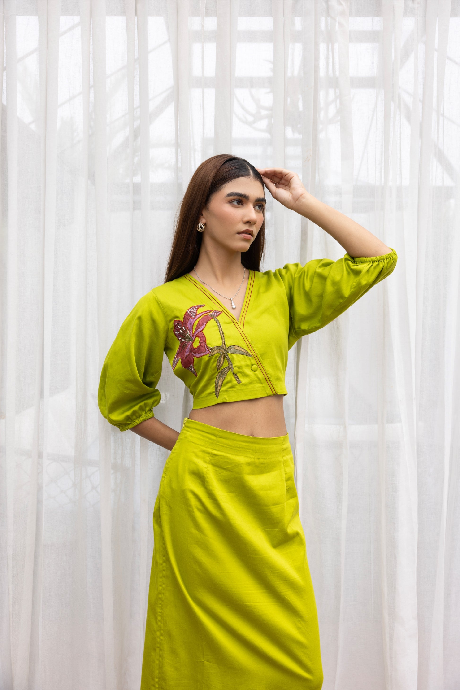 Step into statement style with this vibrant co-ord set featuring a structured crop top and midi skirt in a bold lime hue. The top is accented with a striking hand-embroidered floral motif in shades of magenta and green, adding a playful yet artistic flair. Subtle balloon sleeves and a V-neckline enhance the silhouette, while the skirt hugs the body with clean lines and a back slit for easy movement and a touch of allure.