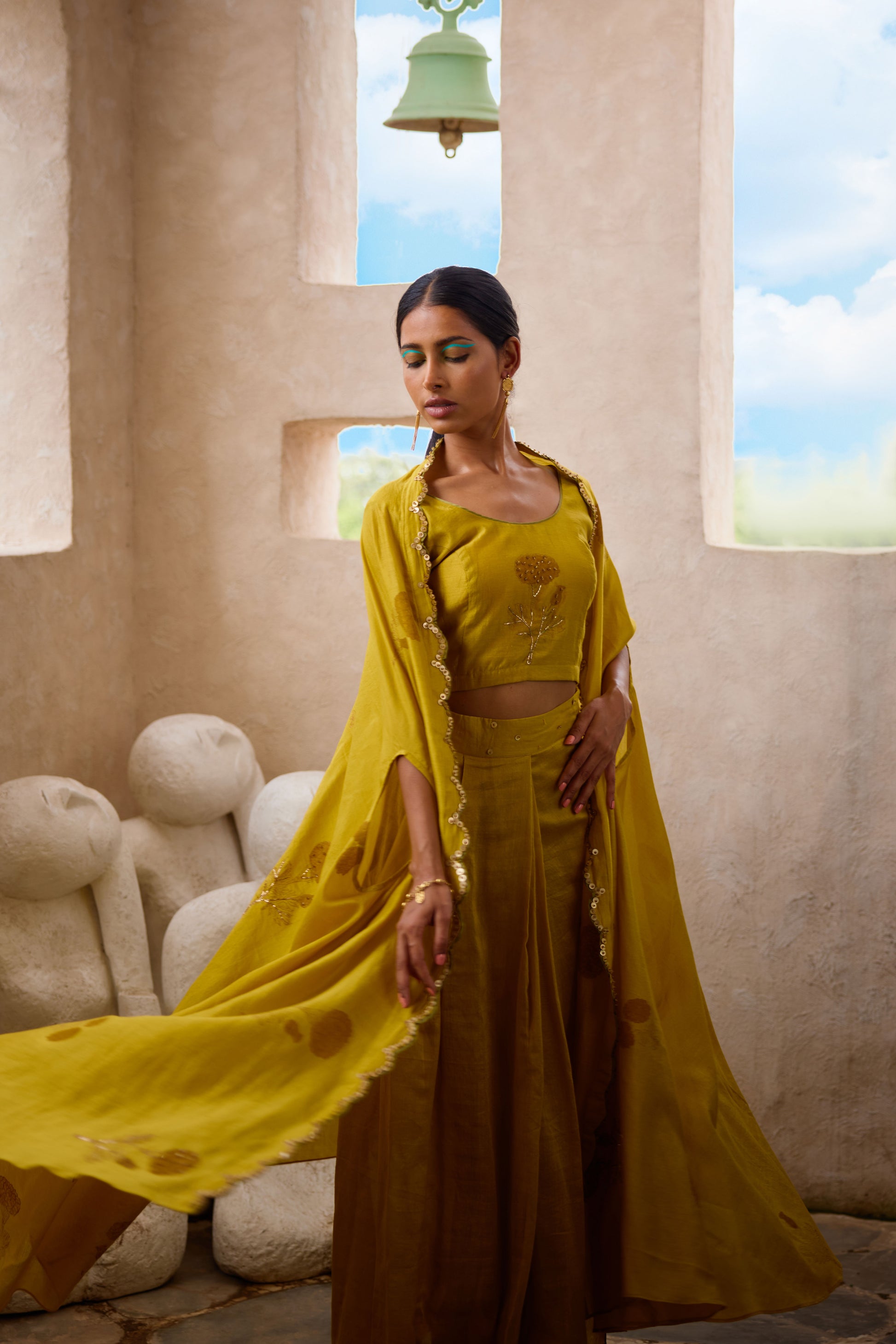Marigold Cape Set embroidered crop top with skirt style dhoti