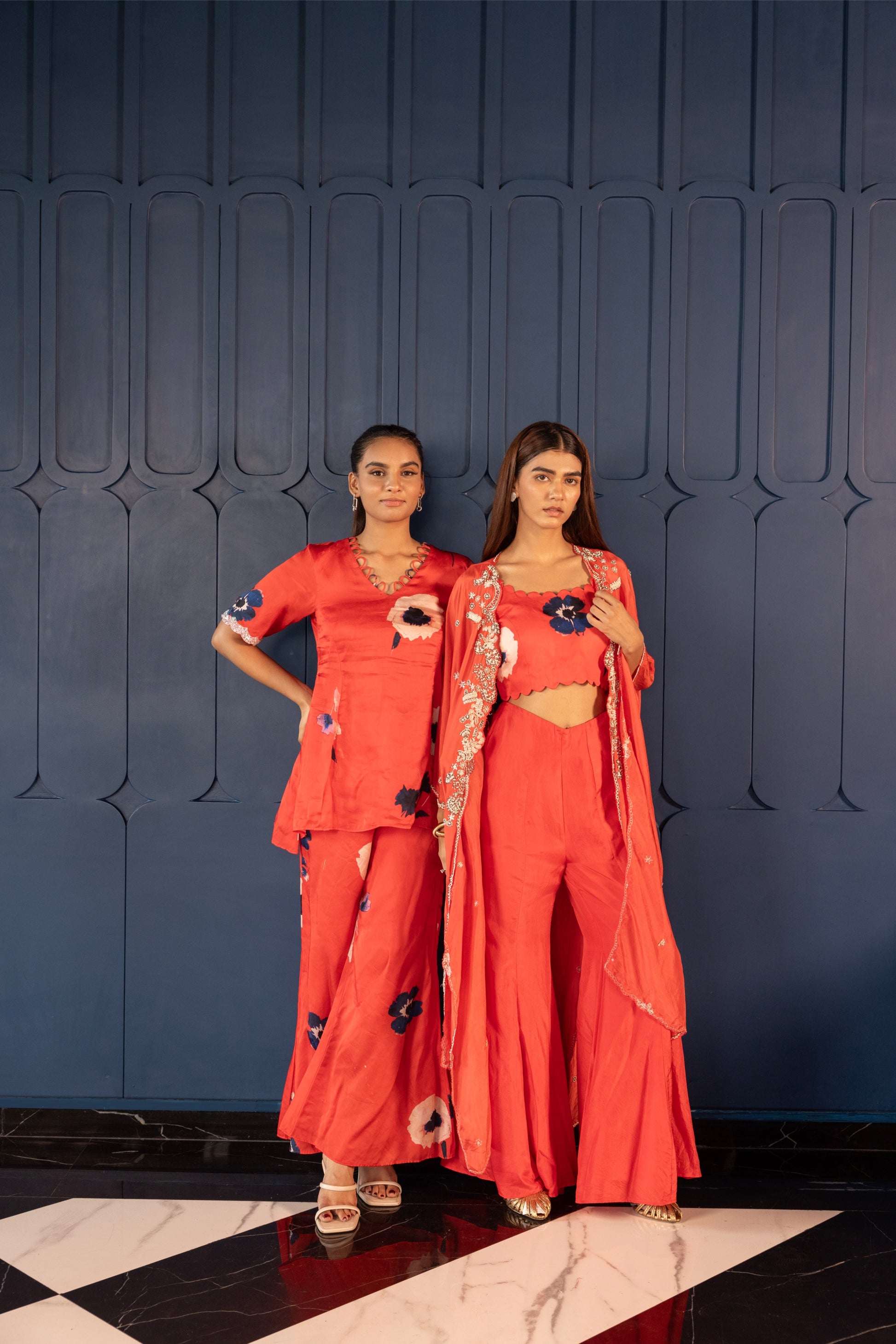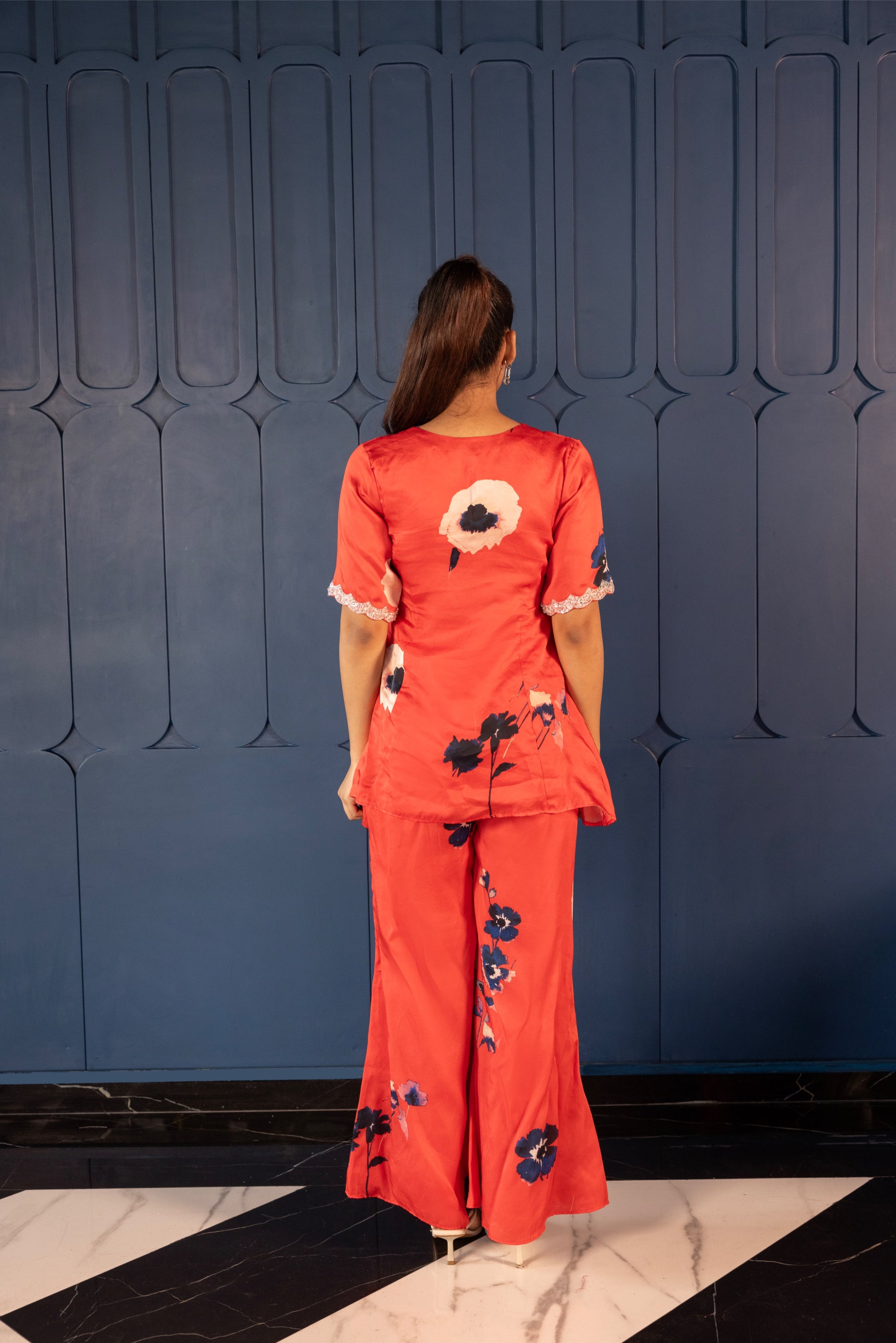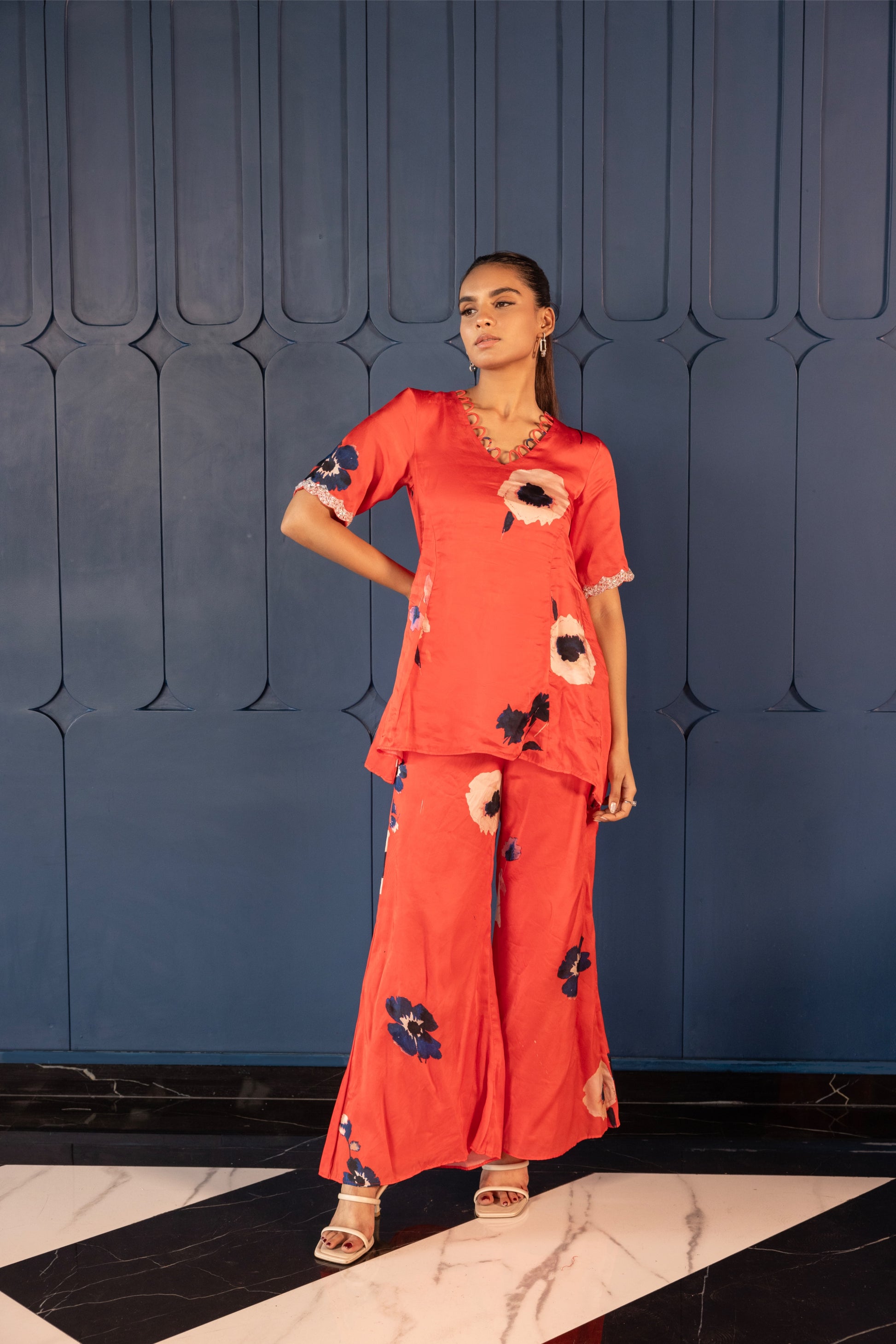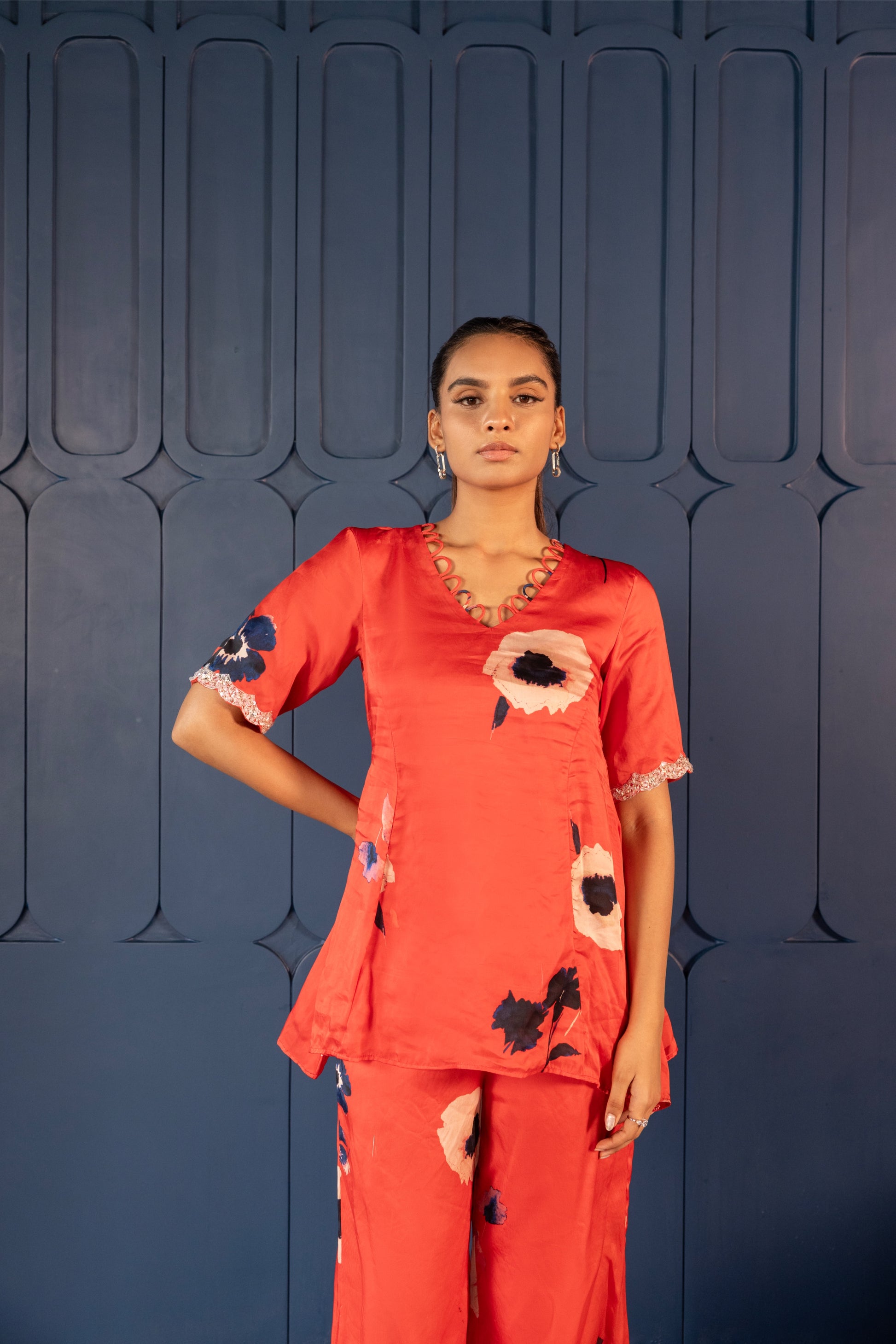 Design & Detailing: A vibrant rust-red co-ord set featuring a relaxed tunic top with scalloped neckline detailing and lace-trimmed sleeves. The wide-legged trousers carry bold poppy floral motifs in navy and ivory, adding playful contrast to the solid base.